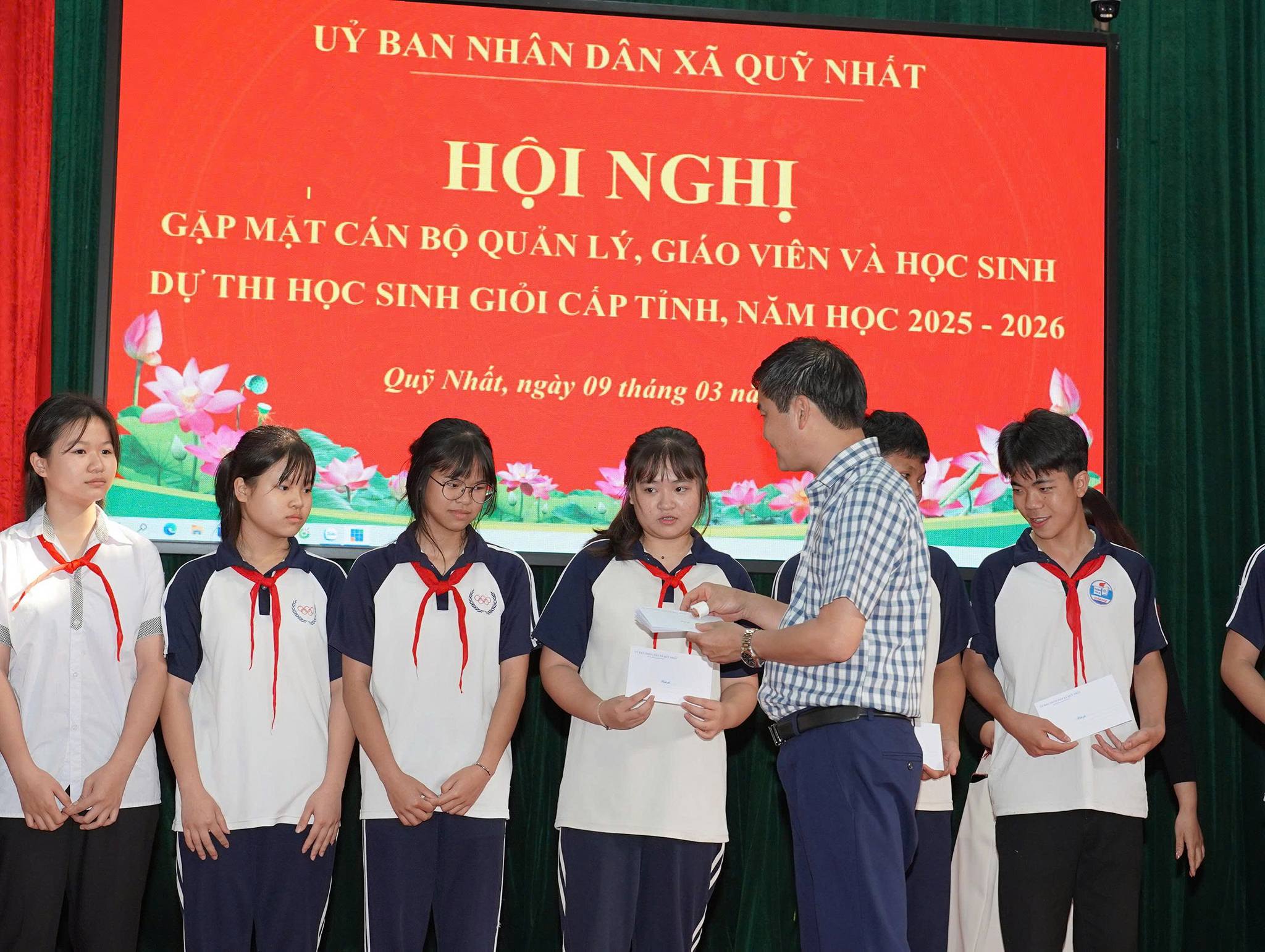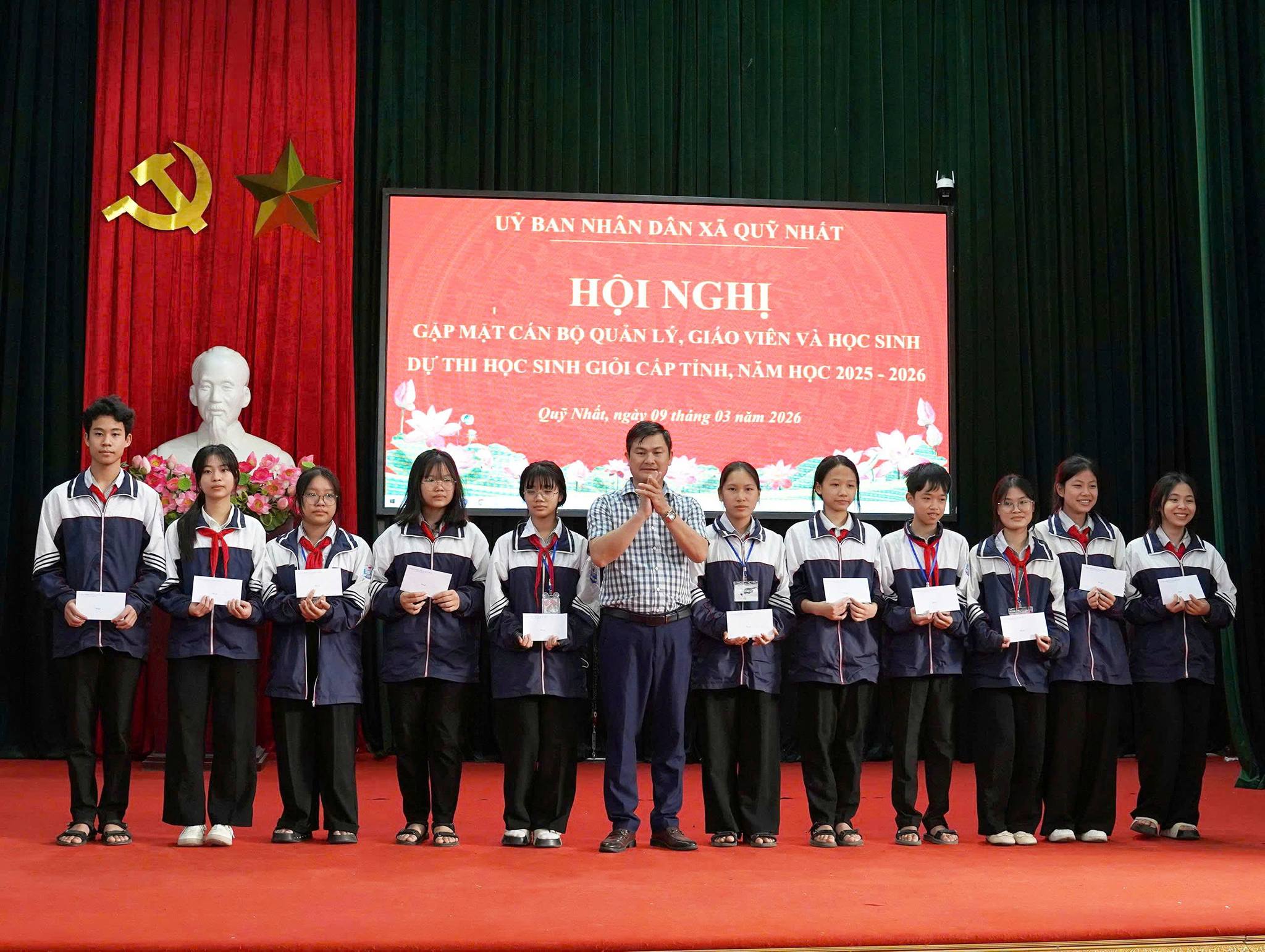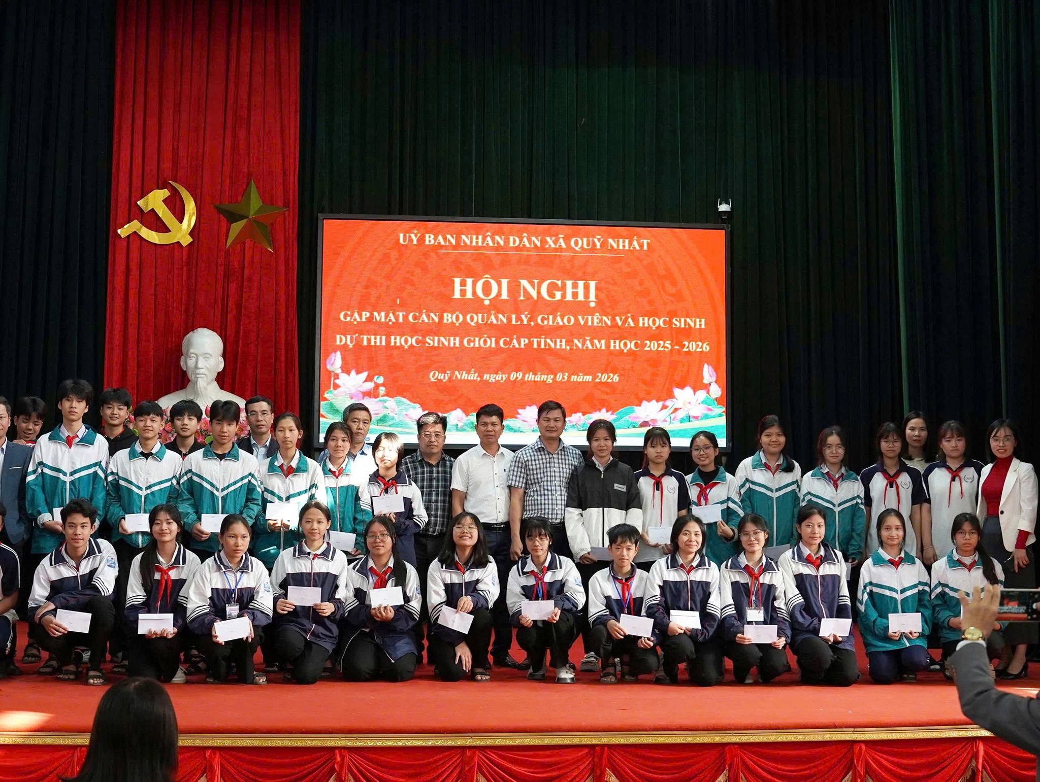 Đặc biệt, sự quan tâm, chỉ đạo sát sao của Đảng ủy, HĐND, UBND xã Quỹ Nhất đã trở thành nguồn động lực to lớn, tiếp thêm sức mạnh cho thầy và trò nhà trường. Nhằm động viên, khích lệ tinh thần và tiếp thêm niềm tin cho các em học sinh trước khi bước vào kỳ thi quan trọng, sáng ngày 09/3/2026, UBND xã Quỹ Nhất đã tổ chức Hội nghị gặp mặt đội tuyển học sinh giỏi tham dự kỳ thi chọn học sinh giỏi cấp THCS tỉnh Ninh Bình năm học 2025 – 2026.